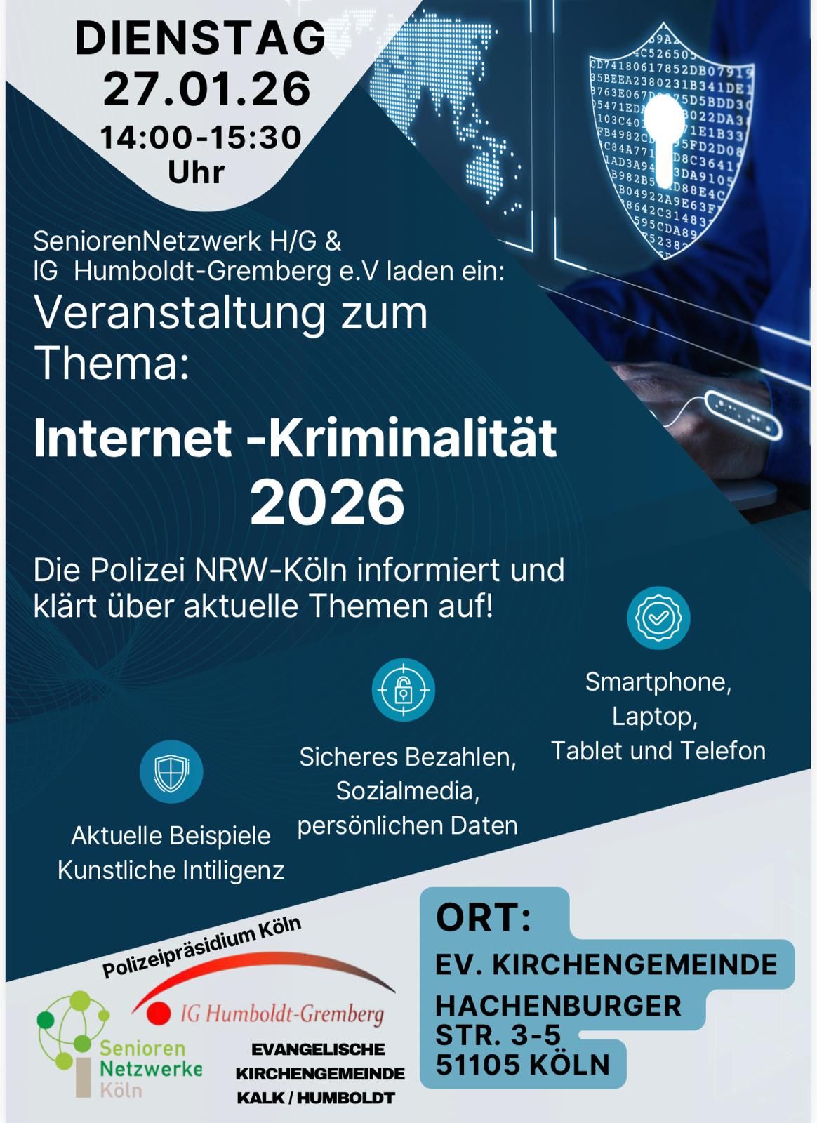 wir möchten Sie herzlich auf die Veranstaltung „Internet-Kriminalität 2026“ des SeniorenNetzwerk Humboldt/Gremberg und der Interessengemeinschaft Humboldt/Gremberg e.V. aufmerksam machen und Sie dazu einladen.